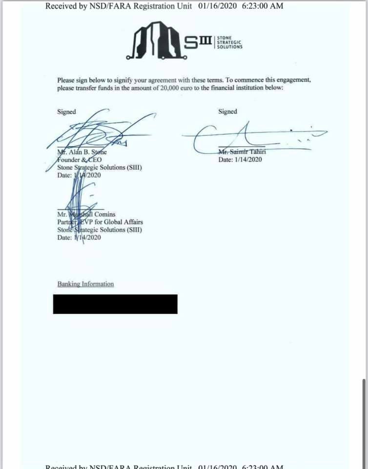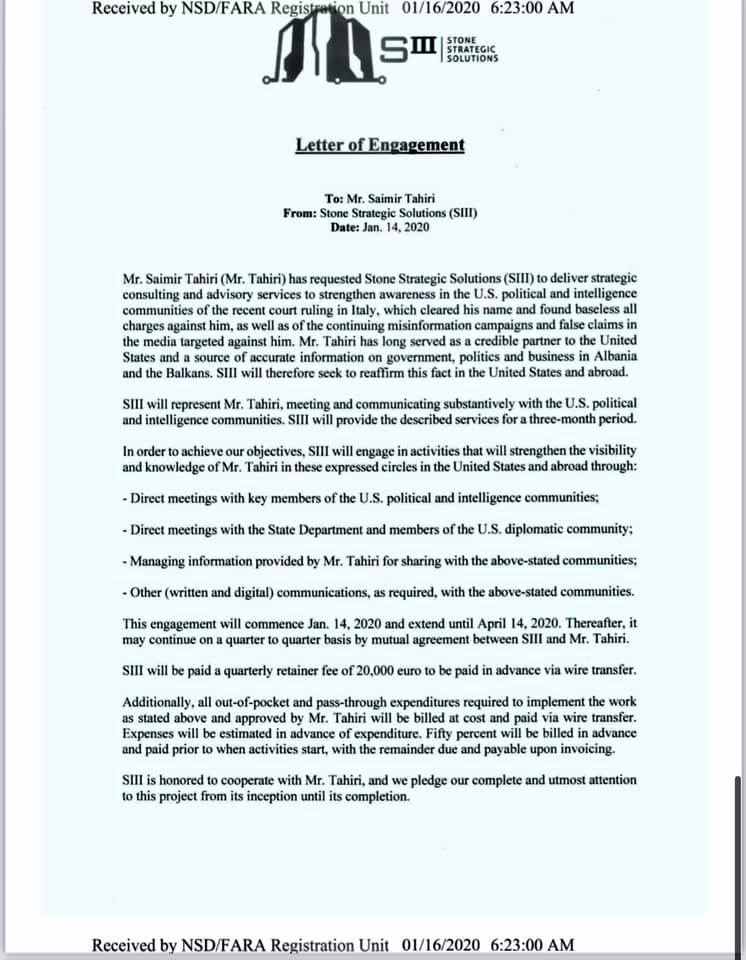 “Saimir Tahiri në 2020 i paguante 20,000€ për trimestër një kompanie lobimi në Amerikë që të “pastronte emrin” e tij mbas investigimit në Itali. Domethënë, meqënëse dje u gjënd i fajshëm, Saimir Tahiri pagonte 20,000 € për trimestër që të gënjente politikanët Amerikan!!”, shkruan Kokalari.