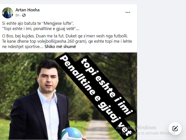 Postimi i plotë i Hoxhës: Si eshte ajo batuta te “Mengjese lufte”: “Topi eshte i imi, penalltine e gjuaj vetë”….O Bos, bej kujdes. Duan me ta fut. Duket qe s’merr vesh nga futbolli. Te kane dhene top volejbolli (pesha 260 gram), qe eshte topi me i lehte ne ndeshjet sportive. Ky top peshon gati 2 here me pak, se topi i futbollit (pesha 450 gram). Kur e gjuan penalltine me topin qe mban ne dore ti, e sigurte qe fluturon mbi porte…Nga nje mik qe ta do te miren. Te lutem anonim. Se çfare nuk pret nga keta, qe luajne me top basketbolli (pesha 650 gram). E sigurt qe nuk u del topi jashte porte, plus te blejne dhe portierin.