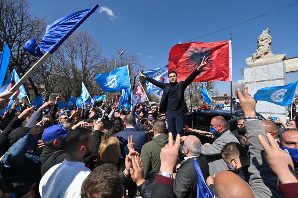 Pas takimit me demokratët në Korçë, kreu i PD-së Lulzim Basha, bashkë me disa mbështetës të tij, lëvizin në këmbë në pedonalen e qytetit.