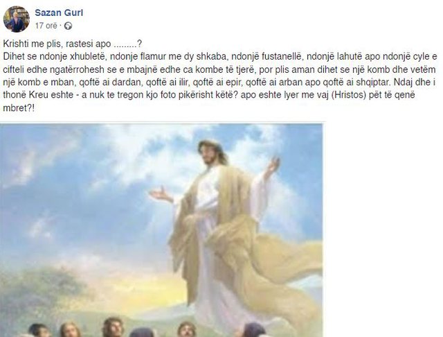 Ndaj dhe i thonë Kreu eshte – a nuk te tregon kjo foto pikërisht këtë? apo eshte lyer me vaj (Hristos) pët të qenë mbret?!”, shkruan Sazan Guri në Facebook.