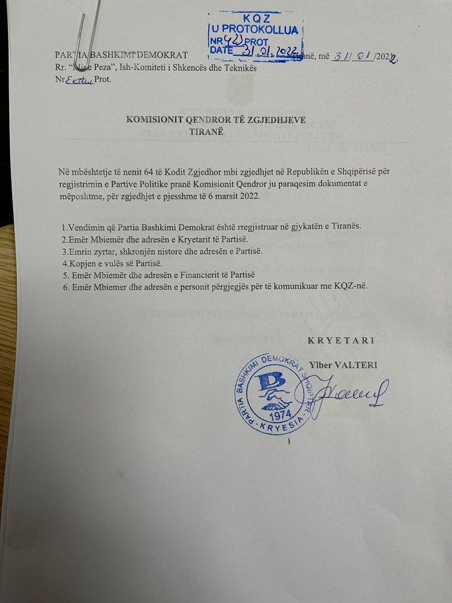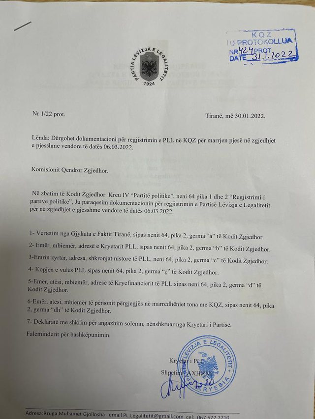 Partia Lëvizja e Legalitetit është grupimi politik i rradhës që ka dërguar kërkesë në KQZ për regjistrim në zgjedhjet e pjesshme vendore të 6 marsit.