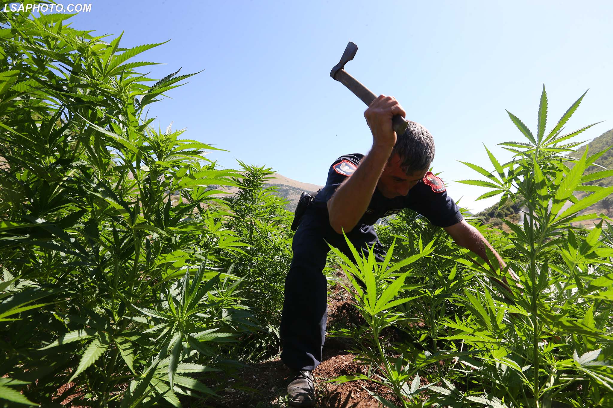 Forca policie te Nderhyrjes se Shpejte, FNSH, duke prere bime kanabis ne mallet e Kurveleshit, ne Tepelene. Policia shqiptare po ndermerr nje aksion te gjere gjate te cilit jane gjetur dhe shkaterruar rreth 16.000 bime kanabis. Deri me tani gjysme milioni bime kanabis jane shkaterruar qe kur qeveria vendosi luften kunder kultivimit te droges dhe trafikimin si nje nga perparesite kryesore te saj./r/n/r/nPolice forces destroy cannabis plants in Kurvelesh commune, 200 kilometers (125 miles) south of the Albanian capital, Tirana. Albanian police found and destroyed some 16,000 cannabis plants and arrested a suspect. So far half a million cannabis plants have been destroyed since the government set fighting drug cultivation and trafficking as a top priority.