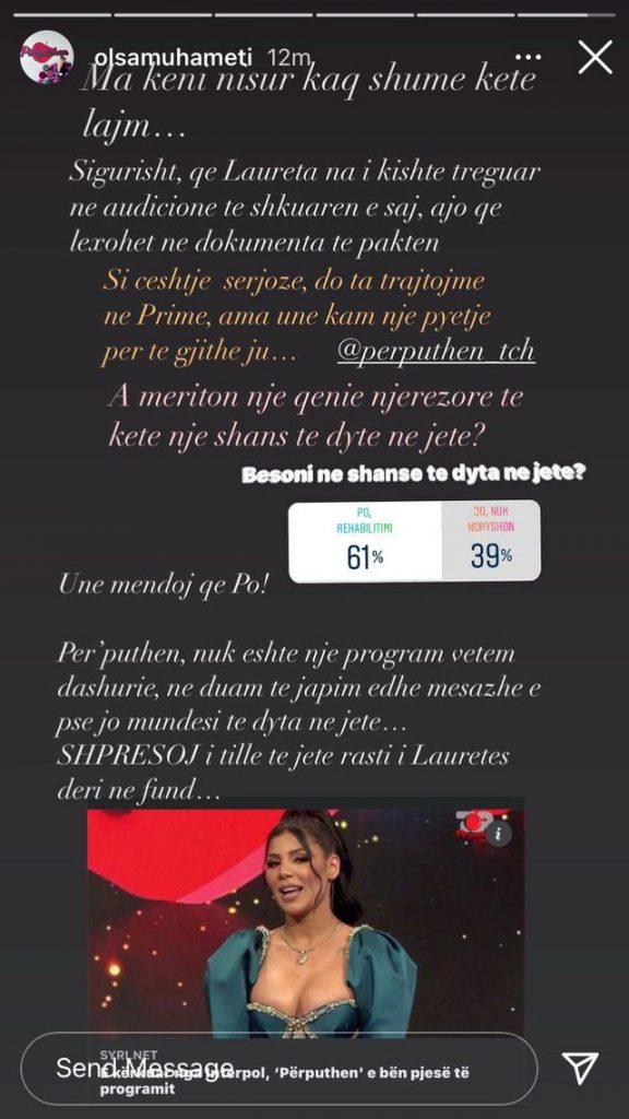 “Ma keni nisur kaq shumë këtë lajm…Sigurisht që Laureta na i kishte treguar në audicione të shkuarën e saj, ajo që lexohet në dokumenta të paktën. Si çështje serioze do ta trajtojmë në Prime, ama unë kam një pyetje për të gjithë ju. A meriton një qënie njerëzore të ketë një shans të dytë në jetë? Unë mendoj që Po! “Për’puthen” nuk është një prohram vetëm dashurie, ne duam të japim dhe mesazhe e pse jo mundësi të dyta në jetë…Shpresoj i tillë të jetë rasti i Lauretës në fund…”,- ka shkruar Olsa.