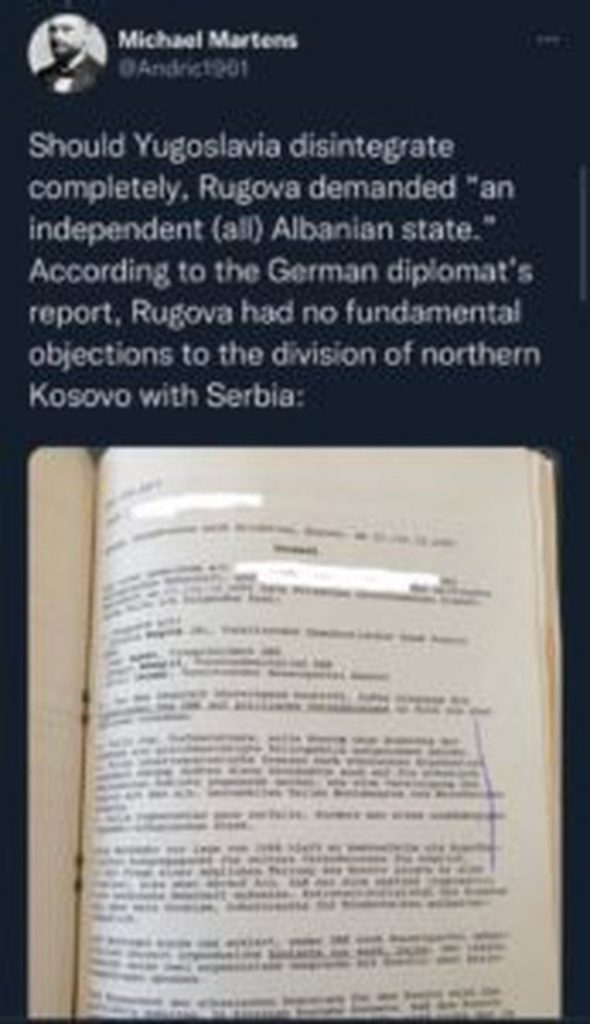 “Nëse Jugosllavia shpërbëhej plotësisht, Rugova kërkonte “një shtet të pavarur shqiptar”. Sipas raportit të diplomatit gjerman, Rugova nuk kishte asnjë kundërshtim thelbësor për ndarjen e veriut të Kosovës me Serbinë”, thuhej në këtë raport.