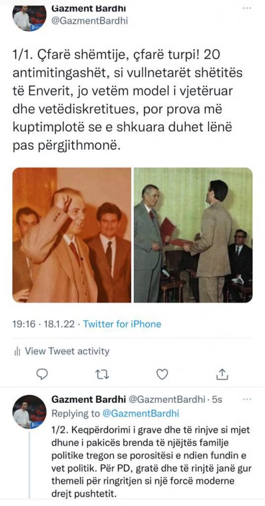 “Çfarë shëmtije, çfarë turpi! 20 antimitingashët, si vullnetarët shëtitës të Enverit, jo vetëm model i vjetëruar dhe vetëdiskretitues, por prova më kuptimplotë se e shkuara duhet lënë pas përgjithmonë. Keqpërdorimi i grave dhe të rinjve si mjet dhune i pakicës brenda të njëjtës familje politike tregon se porositësi e ndien fundin e vet politik. Për PD, gratë dhe të rinjtë janë gur themeli për ringritjen si një forcë moderne drejt pushtetit”, shkruan ai.