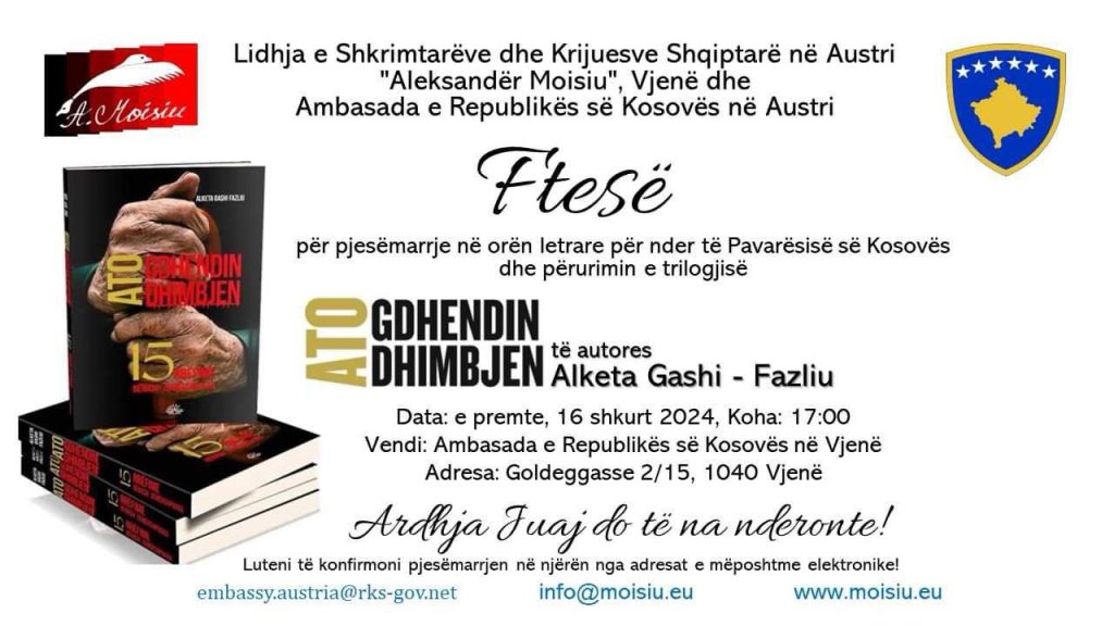 Ambasada e Republikës së Kosovës në Austri, njofton se me rastin e 16-të vjetorit të Pavarësisë së Kosovës, do të përurohet triologjia me titull “Ato gdhendin dhimbjen” e autores dhe gazetares, Alketa Gashi Fazliu.