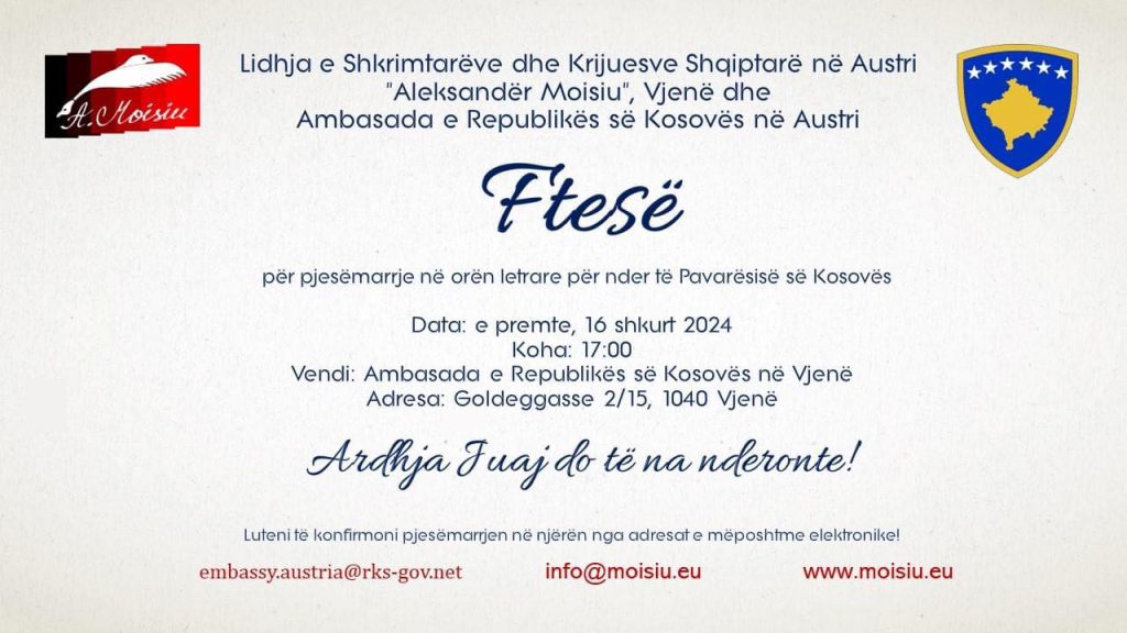 “Ambasada e Republikës së Kosovës në Vjenë, në bashkëpunim me Lidhjen e Shkrimtarëve dhe Krijuesve Shqiptarë “Aleksandër Moisiu” në Austri, me rastin e 16-të vjetorit të Pavarësisë së Kosovës, mban në orën letrare, e cila do të qëndrojë në mjedisin e saj. saj. Ambasadës sonë në Vjenë, ditën e premte, me datën 16 shkurt para orës 17:00. Në këto kulturore profesorë shqiptarë, krijuesit dhe autorët, do të shpalosin krijimtarinë e tire letrare, përmes prozës dhe poezisë, si dhe bëjnë një kumtesë për Ismail Kadarenë, nga Manjolla Zaçellari”, njofton Ambasada e Republikës së Kosovës në Vjenë./RTK/