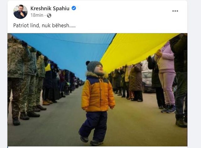 Në këtë situatë lufte në Ukrainë solidarizimi ka qenë i madh. Juristi i njohur Kreshnik Spahiu ka publikuar një foto të një fëmije ukrainas që po qarkullon në të gjithë botën. Fëmija qëndron poshtë flamurit që mbahet nga ushtarë dhe civilë.