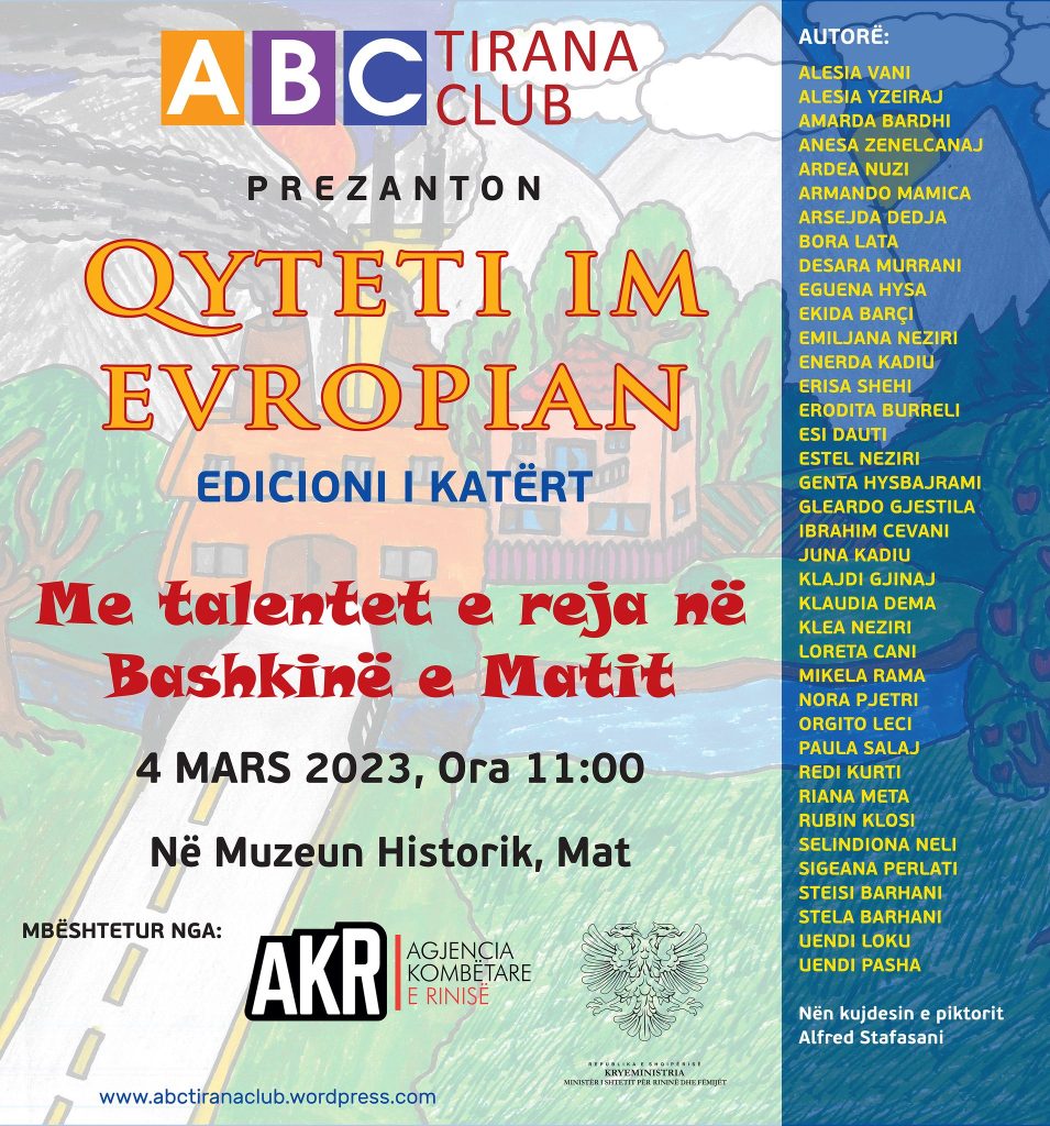 Në mjediset e Muzeut Historik në Mat u hap paraditen e së shtunës (04.03.2023) ekspozita “Qyteti im Evropian”, me punimet në pikturë të 40 talenteve të reja nga shkollat 9-vjeçare “Mustafa Gjestila”, “31 Korriku” dhe “Ilia Qiqi” në qytetin e Burrelit, si dhe nga shkollat “26 Korriku” Bruç, “Abdyrrahman Përmeti” Lis, “Ali Xhetani” Zenisht, “Ibrahim Tema” Kurdari dhe shkolla në Gurrën e Madhe.