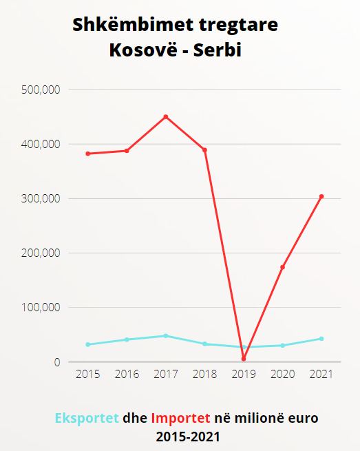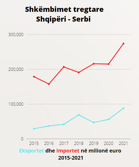 Serbia vazhdon të ketë bilanc pozitivë tregtar me Shqipërinë dhe Kosovën. Shqipëria vetëm gjatë vitit 2021 ka importuar mallra në vlerë prej 288 milionë euro nga Serbia kurse ka eksportuar mallra në vlerë prej 88 milionë euro. Nëse kthehemi në historik, shohim se në vitin 2021 eksportet e Shqipërisë për në Serbia janë trefishuar krahasuar me vitin 2015 kur eksportet kishin vlerën e 3.4 miliardë lekë apo 28.6 milionë euro.