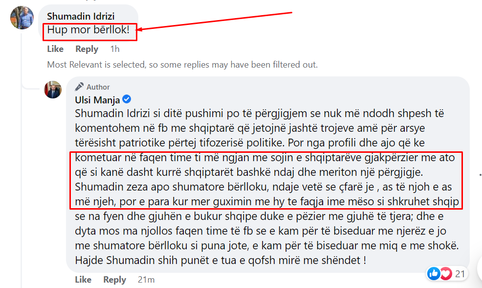 “Shumadin Idrizi si ditë pushimi po të përgjigjem se nuk më ndodh shpesh të komentohem në fb me shqiptarë që jetojnë jashtë trojeve amë për arsye tërësisht patriotike përtej tifozerisë politike. Por nga profili dhe ajo që ke kometuar në faqen time ti më ngjan me sojin e shqiptarëve gjakpërzier me ato që si kanë dasht kurrë shqiptarët bashkë ndaj dhe meriton një përgjigje. Shumadin zeza apo shumatore bërlloku, ndaje vetë se çfarë je , as të njoh e as më njeh, por e para kur mer guximin me hy te faqja ime mëso si shkruhet shqip se na fyen dhe gjuhën e bukur shqipe duke e pëzier me gjuhë të tjera; dhe e dyta mos ma njollos faqen time të fb se e kam për të biseduar me njerëz e jo me shumatore bërlloku si puna jote, e kam për të biseduar me miq e me shokë. Hajde Shumadin shih punët e tua e qofsh mirë me shëndet !”, shkruan Ulsi Manja në përgjigjen e tij.