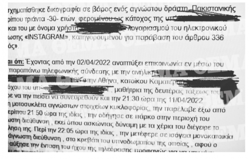 17 vjeçarja e denoncoi 27 vjeçarin shqiptar në policinë e Korydallosit duke thënë se ai ishte pakistanez, duke mos marrë parasysh që ishte shqiptar. Ai ka përdorur një profil të rremë në Instagram, përmes të cilit i është afruar nxënëses së Liceut të 2-të dhe pas komunikimeve të vazhdueshme e ka bindur që të takohen.