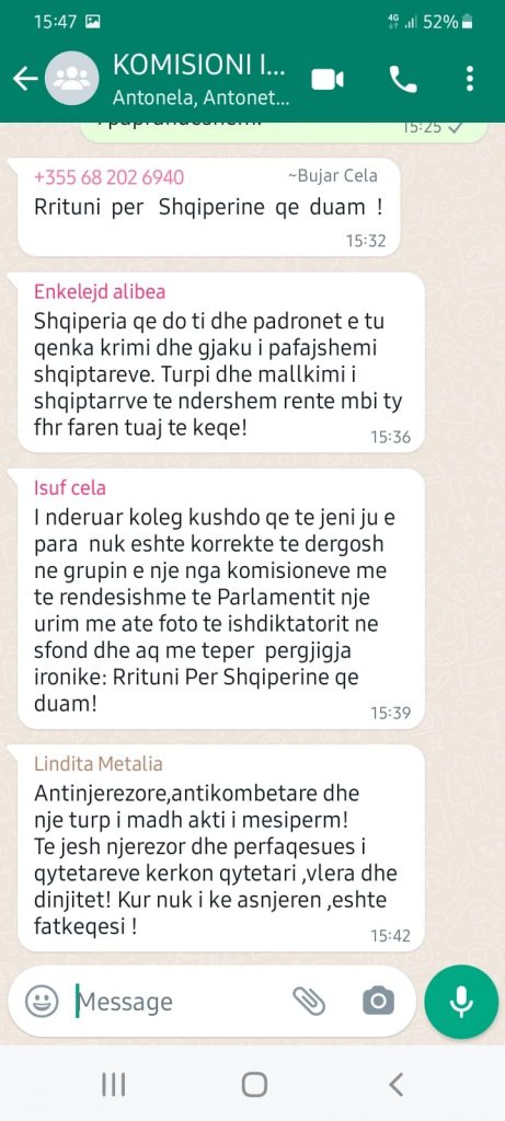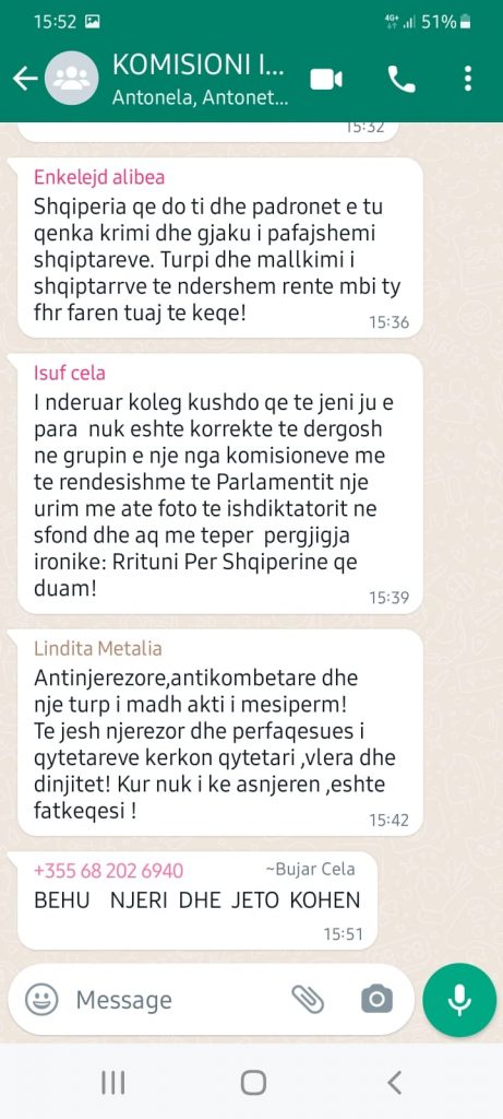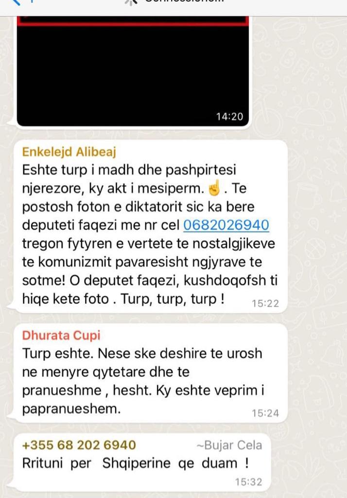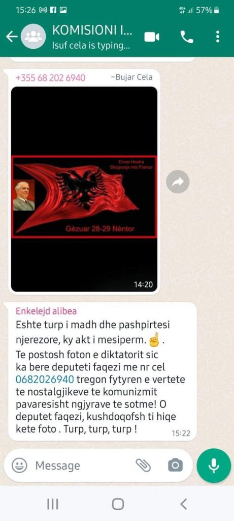 Ja se çfarë poston Bujar Cela, deputet i PS, si urim per diten e pavaresise se shqiptareve: flamurin e shqiptareve me foton e diktatorit përmbi te! Ia ktheva pergjigjjen une dhe koleget e mi deputete te PD! E pra komunizmi, kjo fare e keqe, i ka rrënjët shume te thelle! Duhet urgjentisht dekomunistizim i shoqerise shqiptare! Dialogu mes deputetëve në grupin e whatsap: