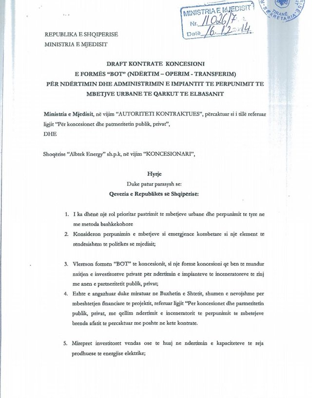 Bushati: Kjo është fleta e parë e kontratës së Elbasanit dhe është Republika e Shqipërisë pa stemë, pa asgjë fare dhe është draft-kontratë koncesioni. Kjo është ajo zyrtarja. Tani kalojme dhe desha te prek pjesen e estetikes qe ju e permendi dhe mundoheni qe ta shprehni pjesen estetike, ju si lider europian a është bukur që emri juaj të jetë tek publikimet zyrtare, permbi tek nje draft kontrate koncesioni? Nje kryeminister te jete permbi nje draft-koncesioni? Është risi europiane qe kryeministri ne Fletoren zyrtare te vendit e vendos emrin ne nje draft kontrate. Turp me te madh sinqerisht nuk ka.